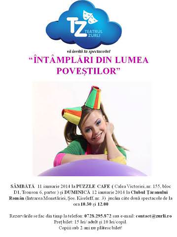 => Spectacolul Fetița Zurli se repetă, dar de data aceasta are loc la Clubul Ţăranului Român între orele 10:30 şi 12:00 – detalii despre spectacol.