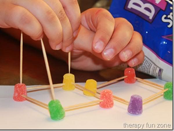 Următorul pas este să decideți care sunt formele sau modele pe care vreți să le faceți și apoi treceți la treabă: luați scobitorile și le înfigeți în jeleuri. Fără lipici, fără nimic altceva, pentru că jeleul are o consistență care susține scobitorile fără niciun fel de probleme.
