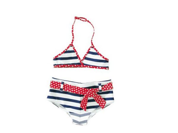 “Ridicaţi ancora şi haideţi în apă!” ar spune fetiţele îmbrăcate în acest costum de baie din două piese, cu model marinăresc în dungi dar şi un accent de culoare roşie atât la partea de sus, cât şi la slip. Sutienul are bretele reglabile în jurul gâtului, iar slipul are betelia şi coapsele din elastic. Orice fetiţă de la 2 la 14 ani îşi poate găsi mărimea potrivită pentru acest costum de baie care costă 87 lei.
